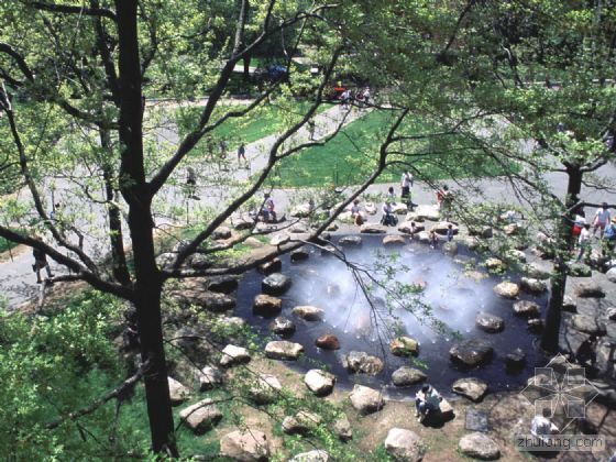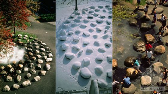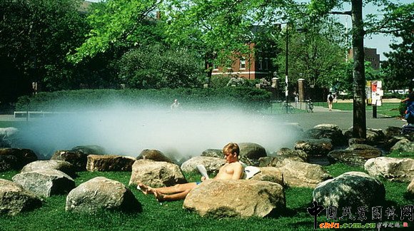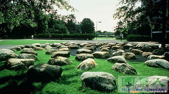 皮特·沃克設計的位于哈佛大學校園內(nèi)的唐納噴泉,位于一個交叉路口,是一個由159塊天然石塊組成的圓形石陣和中心的霧噴泉,所有石塊都鑲嵌于草地之中,呈不規(guī)則排列狀。噴泉噴出的水霧彌漫在石頭上,噴泉會隨著季節(jié)和時間而變化,到了冬天則由集中供熱系統(tǒng)提供蒸汽,人們在經(jīng)過或者穿越石陣時,會有強烈的神秘感。