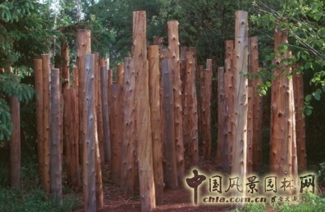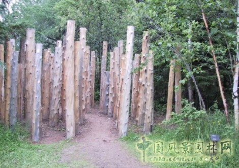 臨時地將規劃土地轉變成花園,或是將森林土地轉變成空地,這是這個花園所要強調的地方。在場地周圍,設計師種植上被剝去樹枝的樹干。當在建設空地和周圍自然環境連貫體的時候,這些樹木提供了空間的限制。在入口處,建造了以個迷宮,柱子高度不同,排布出看起來隨意的風格,并非是要建立鄰近森林的邊界,他們創造了一個過渡性的空間,即是自然的,同時又是人為的。曾經你進入到這個花園中,邂逅的是花壇和其他樹木,這些都已經被砍伐掉,持續的勞動是值得贊譽的,這正是花園和空地所需要的。