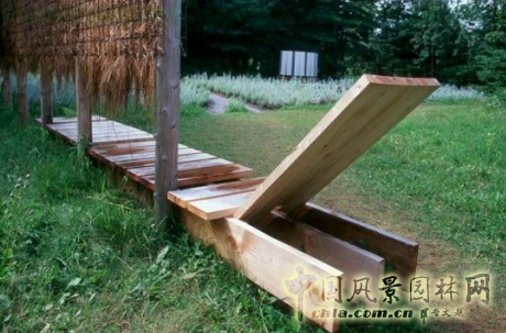 在公園主軸上,長矩形中心,是一塊紀念石。游客被吸引著,躺下來,仰望蔚藍的天空,感覺和風的吹拂,呼吸陽光的味道,在樹間穿梭起舞。在花園的西北角,放置了一個大型號的躺椅,設計師在其背后放置了稻草籬笆,躺椅仿佛舒適地倚靠這稻草籬笆。游客突然間意識到花園是懸于海水上方的一個陡坡上,下面的波浪沖刷海岸。在花園南邊,一個圓木制成的半圓形長凳為好奇者提供了一個神秘的空間,被一塊幕遮擋,與花園分隔開來,另一側用木頭偽裝起來,這里提供了一個很好的視角觀察道路,甚至觀察由此來往的游客。