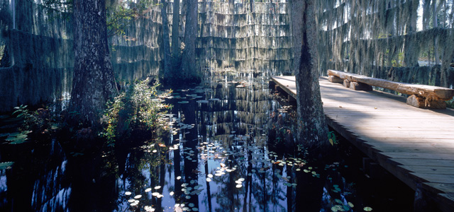 沼澤由一座浮橋與陸地相連接,浮橋一側提供了泊船地點,另一側則設有以柏木樹干為材料的長椅,在這里游人可以如同享受日光浴時的鱷魚一般的悠閑自在的感受寂靜的沼澤體驗。