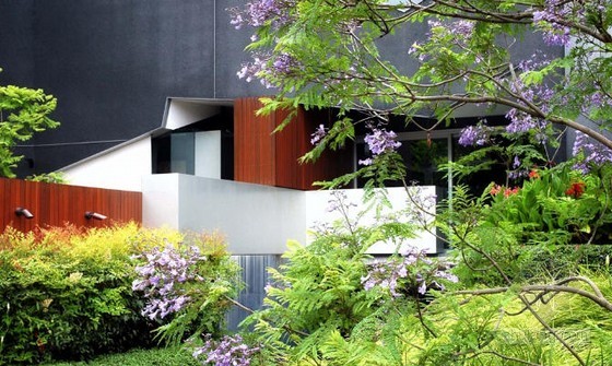 這是Eckersley花園設計事務所為一個精致的住宅打造的庭院景觀,位于澳大利亞,它的設計沒有與住宅設計競爭,而是盡量做到和諧一致,讓人們總是有置身于花園空間的感覺。沖著街道面的植物形成隨意但動感的氛圍,花兒和綠草柔和了不同層次之間的遞進,深綠色的攀爬植物順著石墻垂下,淡紫色的紫薇花點亮嚴肅的建筑表面,每個角落都經過精心打造設計。