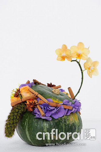trick or treat?不給糖就搗蛋。每年的10月31日是西方傳統節日萬圣節前夜, 每到這晚孩子們會穿上化妝服,戴上面具,挨家挨戶收集榶果,而這時,作為萬圣節象征物的南瓜燈也會表情各異的出現在各個角落,讓人對這個節日的寓意浮想聯翩。南瓜作為蔬果的一種加入花藝作品的方式多種多樣,吳尚洋老師以南瓜為主花器,蝴蝶蘭為主花材,用活潑的表現手法,為我們帶來這款十分應景的萬圣節花藝作品。