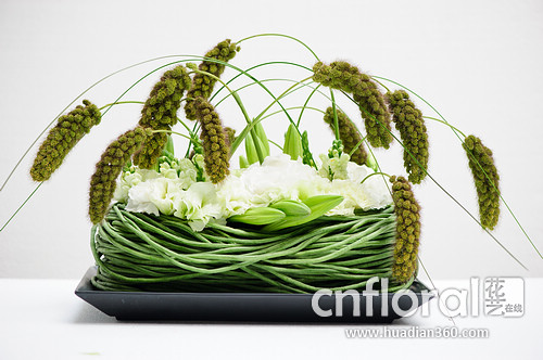 螺旋式插花手法是一種現代的插花手法,通過這種手法花材可以呈現一種清晰、單一方向的線條流動,并以圓圈方向向上、下、內、外延伸,給人以舒暢的視覺享受。螺旋手法的花藝作品一般花束整體效果豐富飽滿,且花莖的螺旋走向無需修飾也能達到很好的觀賞效果,是花藝師需要掌握的最基礎的花藝技法之一。