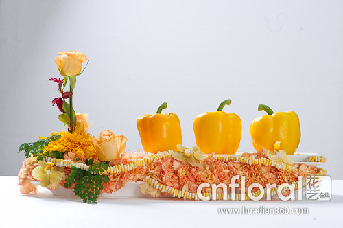 花藝源于生活,生活創造花藝。如今的花藝創作無論是在設計風格還是材料選擇上都越來越貼近生活,你身邊隨處可見的東西都可以巧妙的被安插在花藝作品之中,從而帶來與眾不同的呈現效果。吳尚洋以家居花藝為創作基礎,巧用彩椒、玉米粒等我們非常熟知的材料與花材結合,制作出一款具有別樣新意的家居果蔬花藝。