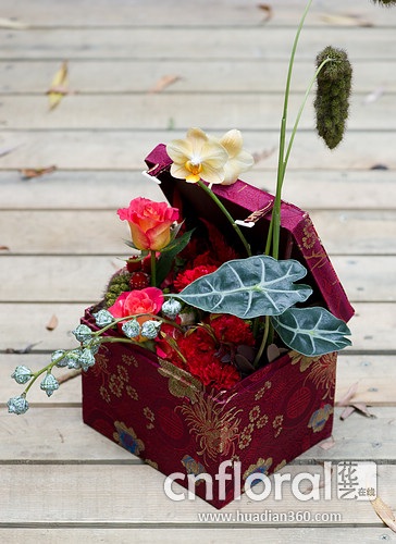 以紅色為主色調的中國風花藝作品在年節尤其受大家歡迎,作品的架構也可以大膽的選擇成容量豐富的禮盒,從而烘托中國年節的紅紅火火和年年有余。吳尚洋為我們呈現的這款中國風的節慶錦盒,作品不僅涉獵了各種色彩熱烈的花材,同時教會我們如何營造與眾不同的節日喜慶氣氛。