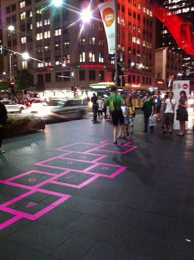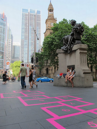 HASSELL通過(guò)Walk the Line這項(xiàng)作品,使城市空間重新煥發(fā)生機(jī),簡(jiǎn)單地在畫畫線,就可以將選定的區(qū)域轉(zhuǎn)變成為游戲空間。街角變成跳房子區(qū)、網(wǎng)球場(chǎng)、彈球場(chǎng);樓梯變成瀑布,十字路口成了大型電玩場(chǎng)地。