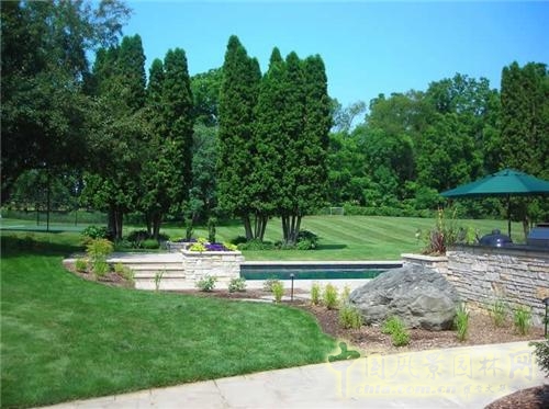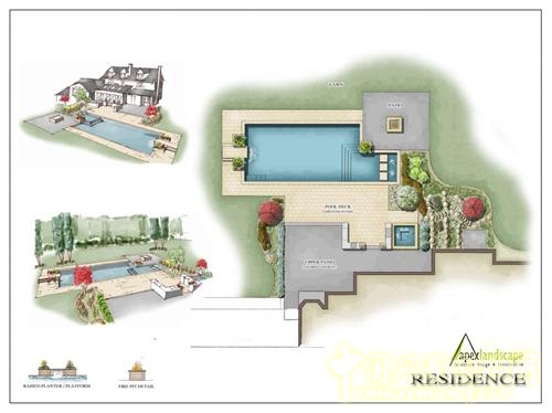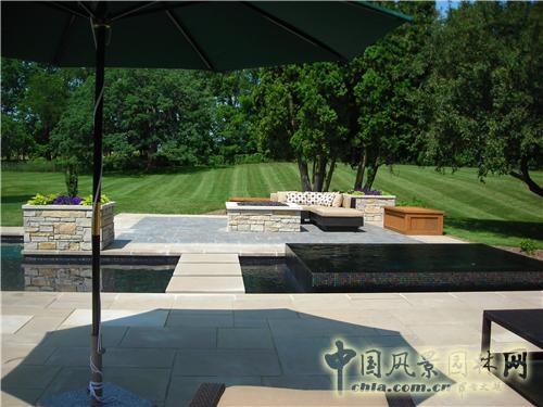 新的庭院設計包括游泳池頂端凸顯的黑色水池、圍繞游泳池的環行臺、石質跳水臺、戶外廚房、餐飲區和燃氣火爐等,是和家人、朋友娛樂的真正消遣場所,給人舒心、閑適的感覺。