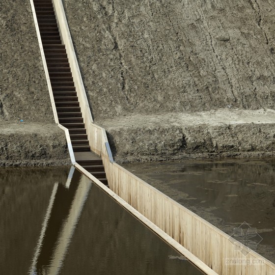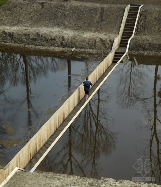 荷蘭西布拉班特河水線是一條防線,包含一系列沿線的碉堡和荷蘭西南部的位于淹沒區的城市。這條防線始于十七世紀,但是在十九世紀頹廢,現在這條防線被加以恢復,一條方便的橋結構成為必需,由RO&AD Architecten建筑事務所設計完成,設計師為此設計了一個別出新意的橋。原名:Moses Bridge,建筑面積50平方米。因為將橋架在壕溝和防御工事之上是非常愚蠢的,這樣敵軍便能輕易掌控局面,這也就是為什么設計師呈現出一個隱形的橋結構,它是一個全木的防水的結構,深嵌于壕溝之內,與景觀天衣無縫地融合。