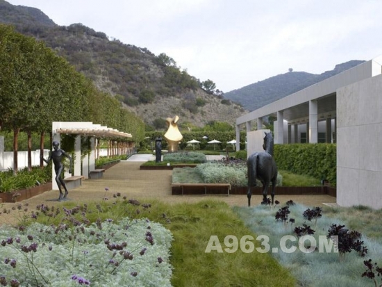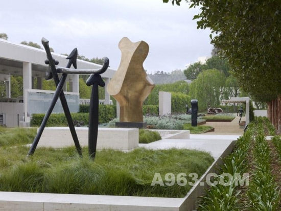 OLIN和Richard Meier合作設(shè)計(jì)這個(gè)項(xiàng)目,從全局考慮,為蓋蒂第一屆當(dāng)代雕塑輯的28座雕塑設(shè)計(jì)了與之相協(xié)調(diào)的建筑與景觀。景觀與雕塑相兼容,讓每一件雕塑的獨(dú)特性展現(xiàn)。藝術(shù)品與觀眾也是互動(dòng)的。有的放置在安靜的區(qū)域,臨近作為或者水景,有些則放置在可以俯瞰洛杉磯風(fēng)景的地方。最后博物館收藏了其中的8件,他們?nèi)匀辉诓┪镳^內(nèi)的花園中。