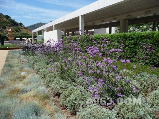 ▲綠地從左到右的植物是:藍(lán)色高羊茅的“Glacua”品種,菊科蒿屬的‘Powis Castle’品種與南美馬鞭草混種,羅漢松綠籬。