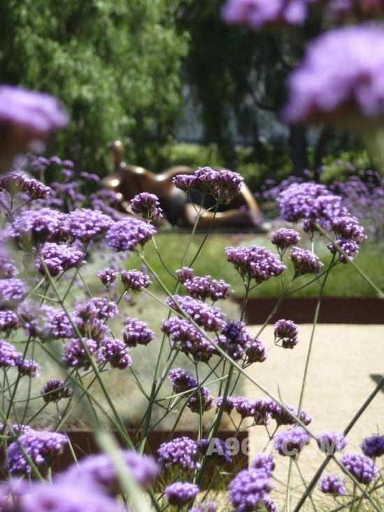 ▲南美馬鞭草與后面的Henry Moore的雕塑 ‘Draped Reclining Mother and Baby’ 。