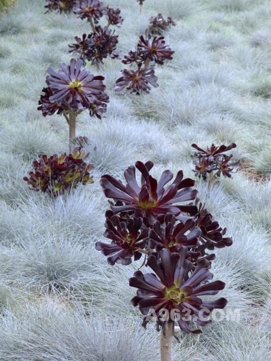 ▲藍(lán)色高羊茅的“Glacua”品種和紫色景滅科蓮花掌屬蓮花掌的“Zwartkop”品種混種細(xì)節(jié),他們的葉片形狀,顏色,機(jī)理產(chǎn)生了對(duì)比。