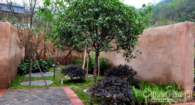 "園"指有圍墻的農作園,是中國傳統園林的雛形,所以"園"的特點是有圍合的空間,展園以夯土墻和水渠圍合成四個小園子即四季花園,按順時針依次為碧桃園、紫薇園、紅楓園和青松園,同時花園的鋪裝也有區別:碧桃園全為植物鋪地,青松園全為卵石鋪地,紫薇園多植物少卵石,紅楓園則是多卵石少植物,由此來強調四季變化中的不同的植物景觀。