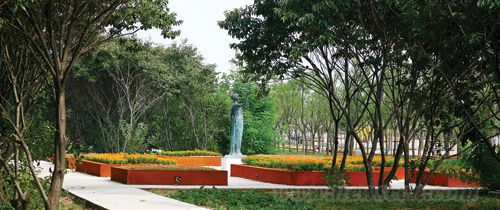 林下雕塑區位于帶狀公園寬闊地帶,一條林下路徑連接了參與性極強的主題雕塑。設計者對林下雕塑區的植物基底采用織錦的方式,運用多種鄉土草本植物和野草以作為林下的基礎植物。