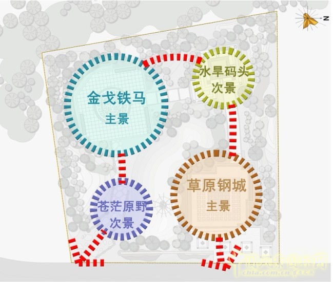 以這四個節點串聯起來的觀賞路線亦可反向路線游覽,讓游人切身感受"變遷"這個主題,園區左右兩側都設置了路口,其中以右邊的入口為主。這樣既可以使游人清楚的了解包頭的歷史,也可充分的延長游人的觀賞時間。