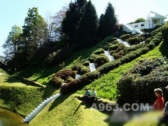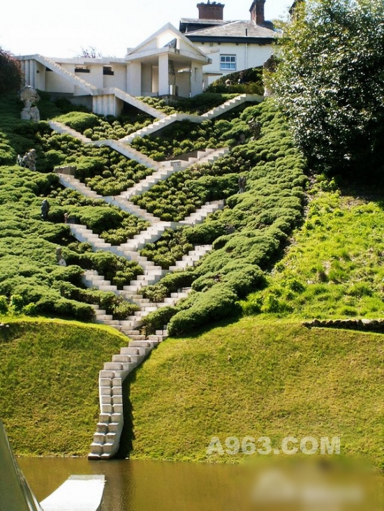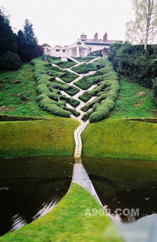 蘇格蘭西南部,有一個花園叫做“Garden of Cosmic Speculation”,里面的景觀設計全部按照各種數學與科學圖形進行設計規劃,如分形,螺旋,黑洞……花園內植物不是很茂密,甚至有些空曠之感,但根據數學公式,曲線等制作出的地形地貌成為花園最奇特的地方。其中后花園的大臺階最具戲劇性,也最吸引人。