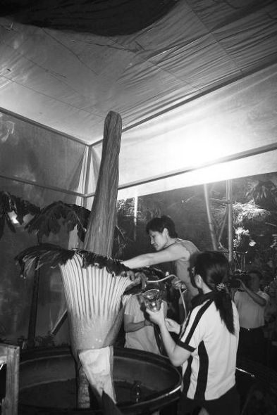 直至2011年5月27日,這株魔芋世界的“鐵樹”開花了。這讓到訪的蘇格蘭愛丁堡皇家植物園的斯蒂芬·史萊克莫爾興奮不已,他那里栽種的一棵泰坦魔芋也將于近期開花。
