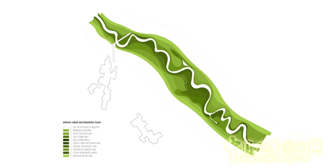中國風景園林網訊 項目簡介:現代主義的風格在鄉村環境中已有所體現,蛇形河的改造打破了傳統的植被綠化。通過對景區半英里多的水文結構修復改造,可以明顯看出項目對自然景觀的保護。也給當地人外出或游客對水體質量、植被覆蓋和生物棲息地維護作參照標準。水體和當地多樣物種群組成了一個多層次的生態系統,改善了原來被破壞了的生態狀況。