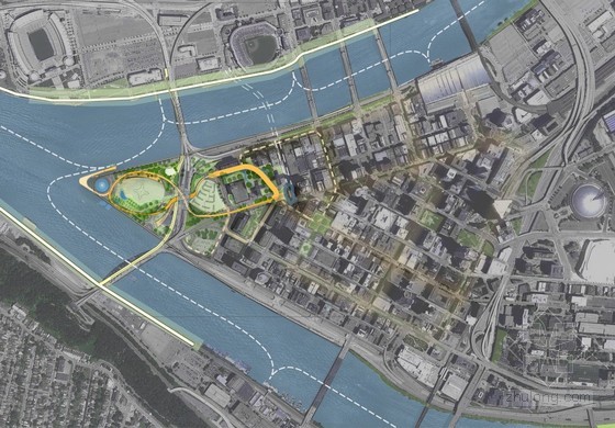 這個項目旨在將城市與河畔空間縫合在一起,形成全新的橋通道結構,原名:The Mobius: Portal to the Point,位于美國賓夕法尼亞州,這是一個莫比烏斯帶,它不是關于將兩個分開的部分聯合起來,更重要的是在巨大的網絡系統中形成綜合性的連接。