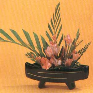 插花寫意的技法多是采用比較粗大的材料,如大片的蕉葉、芋葉、荷葉、干枯的樹葉、枝條或一團草、一簇樹根等,以其隨便,粗放地表現事物的大概面貌,使人想象到那是山、密林、飛瀑等。這種寫意的技法在插花作品中,多起襯托、布景的作用。而寫實的手法是采用線條清晰可辨,色彩鮮明的花朵或葉子插花,用以表現事物的具體面貌。假若一件插花同時采用這兩種技法,那就可使作品玲瓏剔透,枝葉傳神,虛實對比,遠近分明了。②“破”的技法若線條單一,顏色單調無變化會使人感到乏味。在傳統的插花藝術里,常采用“破”的技法,使其產生起伏跌定的效果。如一組表示風勢的線條,在其中加插一兩支反方向的線條,就覺得奇兵突出,激動人心。一組圓形的線條(圓形的葉子,圓形的花),若用一兩支別的形狀的線條來破,就能使插花的內容豐富,增添生趣。如一支比較直的枝條,可以把其插得傾斜些,再用另一屈曲枝條破之,這就可以使整個構圖活了起來。總之,直的常用曲的破,橫的常用豎的破,圓的常用長的破,插花時瓶口的線條不能全露,也常用花或枝葉破之。顏色的處理也基本如是,方不顯得平鋪直敘。“破正求奇”就是中國傳統插花的表現技法之一。