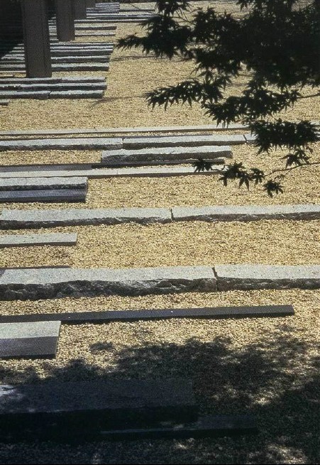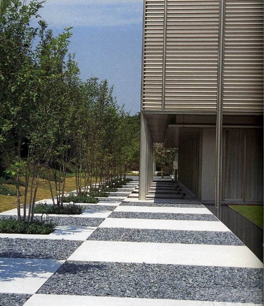 通過采用與建筑平面相配的條紋模式,實現了與建筑物一體化的庭園景觀。