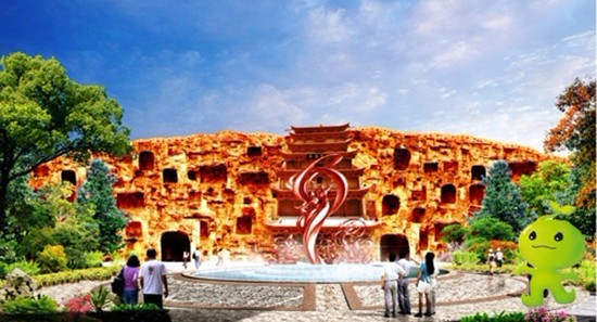 仿制莫高窟的質(zhì)感,假山成為雕塑"大夢(mèng)敦煌"的舞臺(tái)背景。效果圖