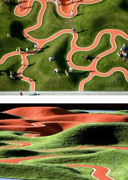 操場一般通過一些預制元素組成,Schmidt教授在德國慕尼黑設計了這樣一種景觀。然而這里沒有典型的操場元素,只是通過兩種材料/色系(花紋以及綠草)組成并且在地形上進行了修改。同時這種起起伏伏的景觀還喚起了兒童在此嬉戲的童心。