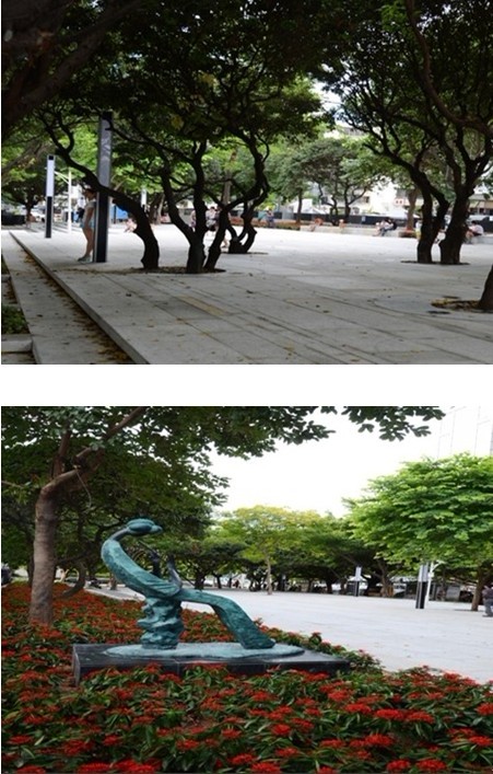 該項目以簡約的現代主義為設計原點,從整體空間以及城市肌理的角度充分考慮,運用“少即是多”的手法設計的道路空間保留了部分大樹,營造視線通透的開闊場地,提供行人與環境交流的良好場所,增添了景觀的藝術感和都市時代感,讓居住者得到更好的景觀設計體驗。