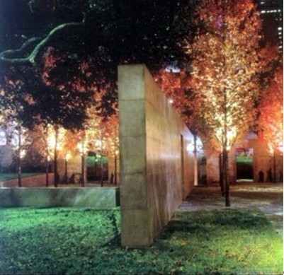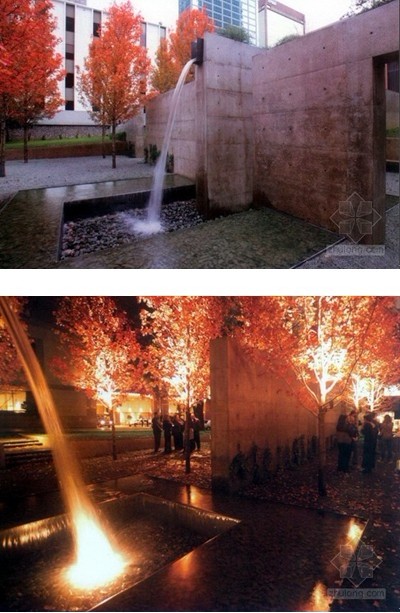 位于達(dá)拉斯城區(qū)的貝克城市公園,是為了紀(jì)念貝克家族居所的奠基人亨利·貝克而建的。受貝克家庭的委托,公園的設(shè)計(jì)結(jié)合了貝克先生工作生涯中所用的建筑材料和設(shè)計(jì)方法,以此方式表達(dá)對他的思念之情,更為城市提供一個(gè)優(yōu)雅舒適的環(huán)境。景觀設(shè)計(jì)師與客戶開展溝通合作,將矩形幾何概念融合到設(shè)計(jì)之中。在這個(gè)矩形的廣場中兩個(gè)混凝土墻將廣場明確地分割成4個(gè)自成比例的小矩形廣場。在墻壁的交匯處一處別致的水景設(shè)計(jì)形成了視覺焦點(diǎn),與周圍喧鬧擁擠的交通形成了鮮明的對比。為了使廣場有更大的矩形區(qū)域,景觀設(shè)計(jì)師縱向排列了土墻建筑,加大了與臨近建筑的間隙。根據(jù)廣場的地理優(yōu)勢,設(shè)計(jì)師設(shè)計(jì)了與周圍的人行路相協(xié)調(diào)的舒適入口。廣場的設(shè)計(jì)盡量避免移動原有的樹木,保證了原有綠化的完整性。進(jìn)入廣場的人行路明顯地分隔出廣場的小空間,穿過墻壁設(shè)計(jì)的連接通道也獨(dú)具特色。這項(xiàng)設(shè)計(jì)同樣為市區(qū)人民提供了清爽、愉悅的公共活動空間,設(shè)計(jì)亦顯示出貝克先生幾十年專業(yè)的建筑技術(shù)引領(lǐng)著公園建設(shè)發(fā)展的方向?;炷翂Ρ诘脑O(shè)計(jì),既優(yōu)雅又凸顯棱角。景觀設(shè)計(jì)師與建筑工程師和結(jié)構(gòu)工程師的緊密協(xié)作不但力求高質(zhì)量的混凝土結(jié)構(gòu),并且確保了焦點(diǎn)形勢和墻壁結(jié)合點(diǎn)與其他相應(yīng)景致的完美結(jié)合。側(cè)面擁壁的設(shè)計(jì)選用了青石。擁壁內(nèi)部的建筑結(jié)合點(diǎn)采用了混凝土材料。水景的設(shè)計(jì)意在突出水體的運(yùn)動和它清幽悅耳的流水聲?;炷翂Ρ诘慕徊纥c(diǎn)和兩條水平線營造的獨(dú)特性,構(gòu)成了完成設(shè)計(jì)的必要條件。高水位水池設(shè)計(jì)巧妙,其水平線與廣場地平線保持水平。低水位水池接收來自高水位水池和頂端墻壁交匯處水渠流下的水,水景的主要看點(diǎn)在于源頭在混凝土墻壁相反方向的水簾。在高低水池上均覆蓋有賓西法尼亞碎石,遮住源泉,給人神秘之感。為了確保夜間行動和安全便利,公園設(shè)計(jì)中增添了燈光設(shè)計(jì)。周圍的橡樹設(shè)計(jì)有向下的汞汽發(fā)光體,創(chuàng)造了周圍的“月光”之境;在廣場內(nèi)側(cè),設(shè)計(jì)師采用了向上的燈光,金屬的鹵化混合物發(fā)出暖光顏色,增添了秋季紅楓的色調(diào)。向下的金屬鹵化混合物發(fā)光選擇周圍的橡樹作為發(fā)光體,為人行道提供光亮。