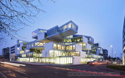 開放的屋頂區域是由偏移的體塊形成的,上面種植了綠色植物,作為屋頂花園使用。建筑向街道大面積開放,商務中心的設計在各個方向都保持一定的透明性。設備管線故意避開了墻體,以減少人們的交流壁壘。方案利用鋼架結構來承載整個體量。使用了k形和X形肋板來支撐,從街道上就能看見辦公室空間邊緣的結構框架。而暴露的鋼結構體也成為室內裝飾的元素,延續整個設計的主題。