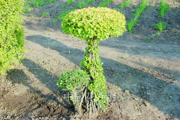金葉榆生長速度快、枝條密集、耐修剪能力強,可培育為灌叢型、喬木型和造型苗木等多樣的產品類型。灌叢型苗是以地面嫁接或扦插培育的、無通直的主干、枝條分布均勻且分枝量較大的叢生苗木;喬木型苗指由具有獨立通直的主干、樹身高大的苗木,一般用白榆高接培育;造型苗是指經過人工造型,以突出特有形狀(如球形、懸空球形、柱形、動物形等)為主的苗木。這些類型的產品目前均已在各地的園林工程中得到廣泛應用。