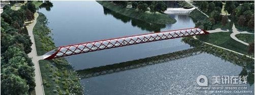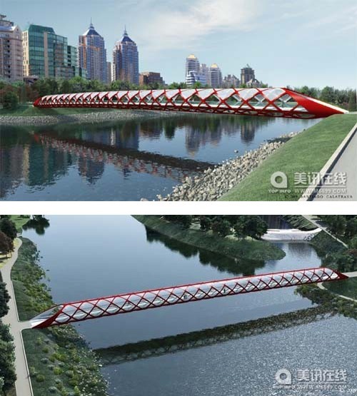 加拿大的卡爾加里市將投資2450萬美元修建一種新的天橋,設計由西班牙圣地亞哥卡拉特拉瓦公司設計。紅色和白色德爾管狀結構,將跨越弓河連接北岸市區,將使人們更容易步行或騎自行車出城。