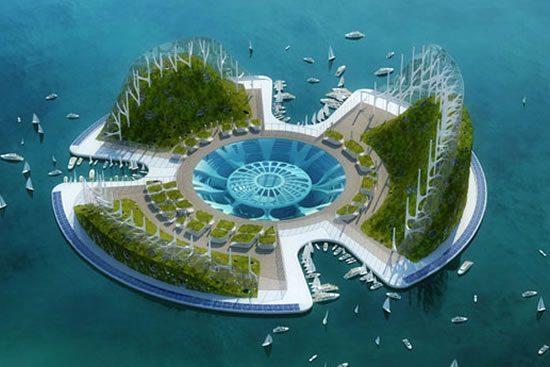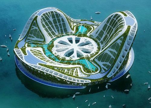 整個城市的下半部分在水下,水上部分則主要用于獲取太陽能。建筑全面的墻和屋頂都幾乎經過了綠化,上面覆蓋著草坪,中間部分則是微型的綠洲,再下面則用作自然海洋浮游生物和植物的溫床。浮動生態城突出的特點是物質能全部可循環,海洋生態系統能產生氧氣和電力,同時回收再利用二氧化碳和廢棄物,水的凈化和軟化均采用生態系統完成。
