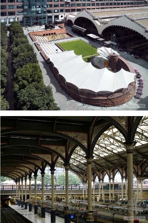 這個(gè)廣場正好位于一個(gè)仿19世紀(jì)哥特風(fēng)格火車站前面,這個(gè)火車站為廣場提供了絕佳的設(shè)計(jì)背景,成為設(shè)計(jì)的主要組織裝置,并刺激了火車站站臺(tái)和廣場之間的互動(dòng)。在這個(gè)空間可以看見或聽見另一個(gè)空間,反之亦然,設(shè)計(jì)因此升級了游客的感官體驗(yàn)。