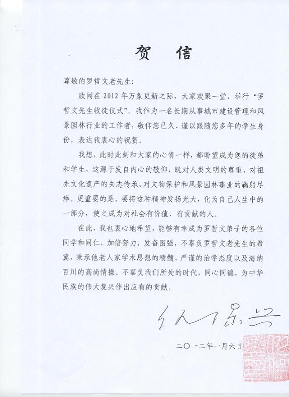 羅哲文先生收徒儀式舉行 仇保興致賀信