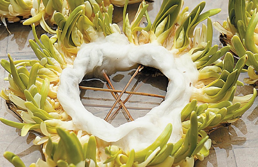 花塔是怎樣砌成的? 羅叔左手拿起一個水仙花頭, 右手持小刀, 像開蟹蓋一樣, 將一片片葉子撕開, “葉本來向上伸張, 這樣一撕, 葉翻過去另一邊,橫放像蟹爪, 一個星期后調整花葉”。