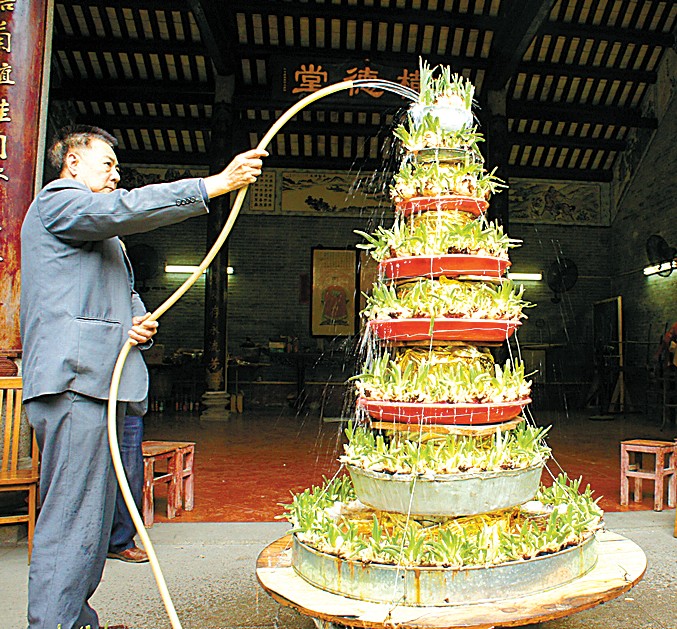 農歷新年將到, 水仙花可謂家家必置的花卉之一。在海珠區康樂村的羅氏祠堂里, 有一個由一百零八個水仙花頭組成的水仙花塔, 足足有八層高, 正含苞待放, 被附近街坊稱為“廣州一絕”。然而, 由于年輕人不肯學相關的技術,有羅氏族人擔心水仙花塔將成“絕唱”。