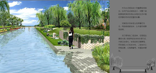 與09省道交叉口是園區的主入口。規劃河道寬度20米,河道北側為10寬綠化帶,河道與道路間為30米綠化帶。該道路總綠化面積約為268260平方米。