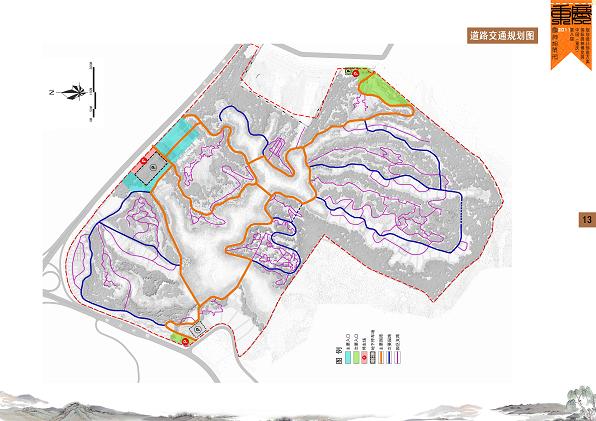 在道路結(jié)構(gòu)上形成"雙線環(huán)繞,支環(huán)相扣"的結(jié)構(gòu)。在交通體系上分成陸上和水上兩個(gè)體系,其中陸上交通形成三個(gè)道路層次,主要園路寬度6米,次要園路寬度4米,園區(qū)支路寬度1.5米。水上交通由碼頭和水上游線構(gòu)成,共設(shè)置7個(gè)碼頭和六條游線。