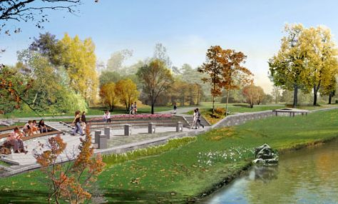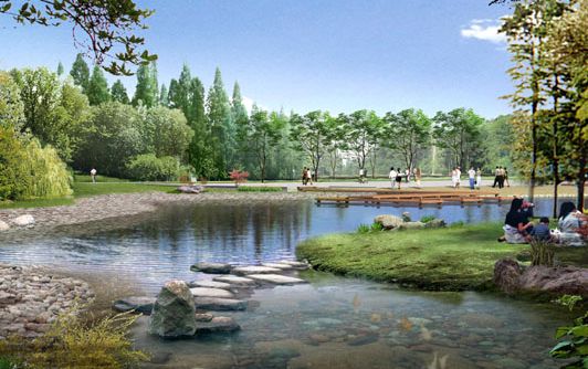 中央公園和濱河綠帶是城市的生態綠島,是新區居民的主要游憩場地。設計原則:1.著重解決新區和老區的文脈關系,與傳統相連,又不失現代感,景觀盡力體現三門濱海城市的特點;2.著重解決防洪要求和游憩功能的結合;3.處理好公園與南北兩端市政廣場和商業廣場的關系。