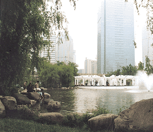 虹橋花園的景觀設計注重從三個不同視角的觀賞效果,一是從周邊高層建筑上俯視的景觀效果;二是從延安西路高架上流動車輛上的動觀效果;三是從街道向園內觀賞的效果,園內布局自然清新,水體變化豐富,形式多樣,流暢的園路系統,星星點點的景觀小品,宛如一幅中國山水畫,植物配置注重常綠喬木林和色葉喬木林的搭配,以及花灌木,臨水植物的栽植,并引進10多種,豐富了植物景觀,新虹橋中心花園于2000年9月向市民免費開放。