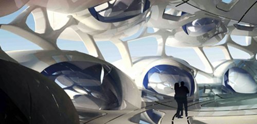 豆莢艙體隨周圍環(huán)境和文脈關(guān)系而旋轉(zhuǎn)變化。這樣一個(gè)仿生的、異想天開的優(yōu)美想法,呈現(xiàn)出一種靈活多變的未來派建筑系統(tǒng)。