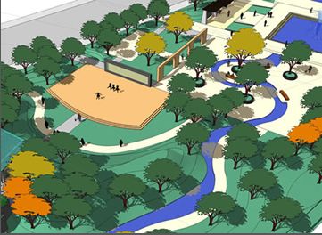 北側主要由混凝土分割的完美空間和游樂場所組成。設計盡量避免移動原有樹種,保證原有綠化的完整性。以混凝土墻作為分割空間的主要元素,設計出既樸素又富有質感的景觀空間;以矩形和直線作為設計語言,設計出宜人的空間。通過地形豎向設計,形成三維起伏的空間,用材料質感、色彩的變化營造另類、易于親近的供家長兒童相互交流游玩的景觀空間。