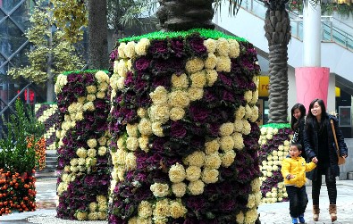 記者來到光谷步行街,發(fā)現(xiàn)街兩旁、護欄、行道拐角、觀光電梯外墻等處均被擺上各式各樣的花木,整條街道顯得春意盎然。花木包括郁金香、報春、杜鵑、年桔等花卉和觀果植物。