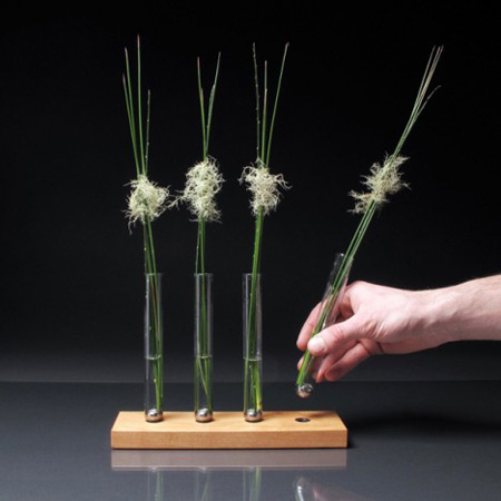 這個創意花瓶,是一個經過精雕細琢的的花瓶(98美元),它和我們平常的花瓶不一樣哦。它的設計很特別,在木材基地有4塊磁鐵,只要有4個玻璃試管和4個不銹鋼球,小心把不銹鋼球體放置在試管的底部,然后擺好,花瓶可以傾斜,擺變成所需的配置。有了它,插花時可以用一種獨特的方式了。