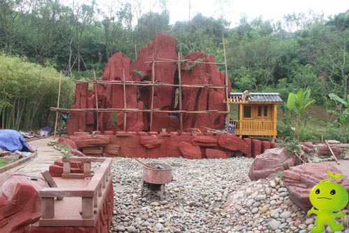 遵義展園最主要的景觀是"丹霞谷",是位于遵義赤水地區的、聞名海外的丹霞谷縮影。在一大片綠色植物的掩映中,丹霞谷呈現紅色。展園施工負責人肖遠強告訴記者,丹霞谷內的丹霞石是一種紅色石頭。丹霞石被嵌入綠色植物之間的溝谷中,再配置上瀑布景觀,在綠洲中構成了一道獨特景觀。