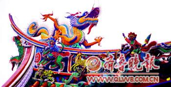 以山東曲阜孔廟為例,它正殿前有十根浮雕水磨石柱,每根柱上有云龍兩條回舞盤旋,遠望只見云龍飛舞,不見石柱,為建筑史上罕見的雕刻珍品。 在中國古代,一般屋頂的脊線兩側通常有龍頭突起,叫做鴟吻,上面排有12個窯冶造型,第一個是仙人,后依次為龍鳳獅麒麟天馬海馬魚獬等。建筑群外圍墻的墻頭,用琉璃瓦砌成波浪起伏形,一端塑上一個龍頭,就成了“龍墻”,也別有趣味。