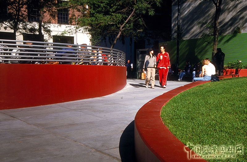 公園的外圍是有獨特色彩的帶狀墻和和雕刻成細管組的墻,減弱了城市網(wǎng)格狀結(jié)構(gòu)。角落的咖啡座可以同時觀看公園和路邊活動。