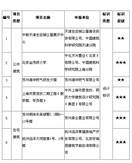 根據(jù)《綠色建筑評(píng)價(jià)標(biāo)識(shí)管理辦法》(建科[2007]206號(hào))、《綠色建筑評(píng)價(jià)標(biāo)準(zhǔn)》(GB/T50378-2006)、《綠色建筑評(píng)價(jià)技術(shù)細(xì)則》(建科[2007]205號(hào))和《綠色建筑評(píng)價(jià)技術(shù)細(xì)則補(bǔ)充說(shuō)明(規(guī)劃設(shè)計(jì)部分)》(建科[2008]113號(hào)),我部組織開(kāi)展了2011年度第二十一批綠色建筑評(píng)價(jià)標(biāo)識(shí)項(xiàng)目評(píng)價(jià)工作。經(jīng)審定,中新天津生態(tài)城公屋展示中心等6個(gè)項(xiàng)目獲得綠色建筑評(píng)價(jià)標(biāo)識(shí)。