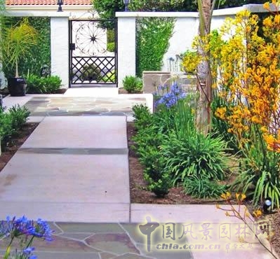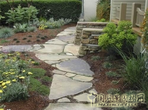 圖中園路是由大小不規(guī)則的石板直接拼接而成(干拼)。干拼可以讓水滲入到土中,使植物在石頭間生長。幾年后,石板間長滿植物時(shí),這條石板小道就形成了另一種全新的生活環(huán)境。